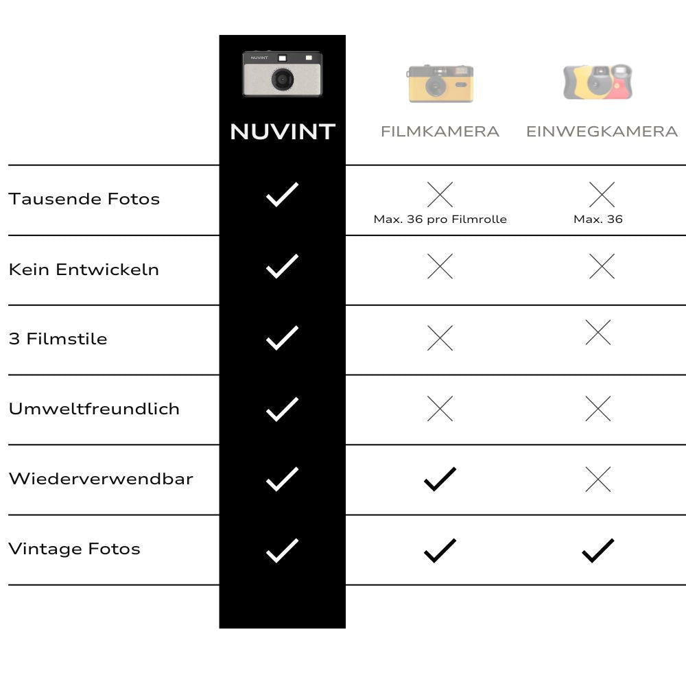 Die NUVINT ist eine bildschirmfreie Digitalkamera, die wie eine Analogkamera aussieht, aber keinen Film benötigt. Alle Fotos werden direkt auf der SD-Karte gespeichert und können per USB-C Kabel heruntergeladen werden. Die Kamera ist perfekt, um schöne Momente im Vintage Look festzuhalten.